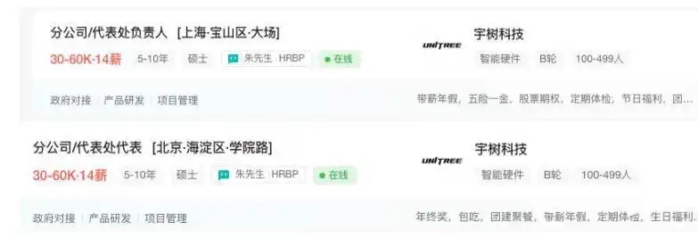 此外,宇树机器人正在抓紧设立上海和北京分公司。相关招聘平台西An是,宇树科技正在招聘上海和北京分公司/代表处负责人,月薪为3万至6万元。根据公开报道,宇树科技联合创始人陈立向媒体确认宇树科技将要在北京设立分公司。